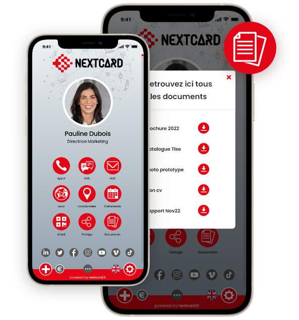 Avec la fonctionnalité document, faites en sorte que les documents clés de votre entreprise soient disponibles auprès de votre audience à tout moment. Gérez et modifiez votre liste de documents depuis votre NextCard ou en vous connectant à votre espace client.