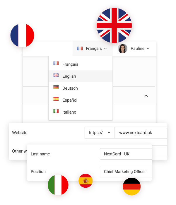Profitez de la fonctionnalité multilingue de Nextcard pour adapter le contenu de votre carte de visite à toutes les langues. Il vous suffit de sélectionner la langue souhaitée pour que tous les libellés soient traduits, insérez ensuite le contenu traduit par vos soins dans les champs correspondants. N’oubliez pas de répéter cette opération pour chaque langue pour garantir une traduction optimale.