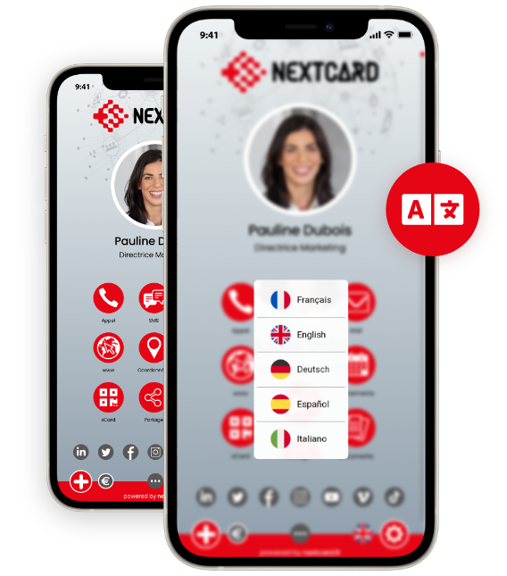 Votre NextCard est disponible dans plusieurs langues et s’affiche automatiquement en fonction de la langue du navigateur de votre interlocuteur.